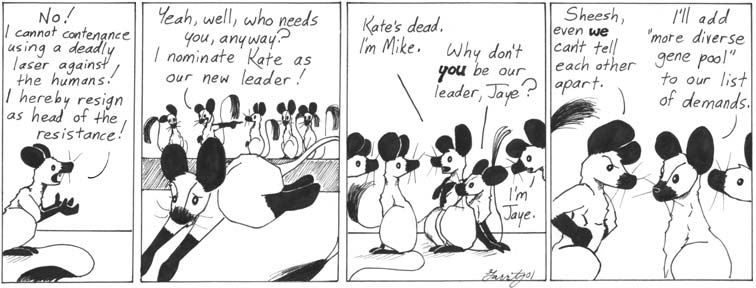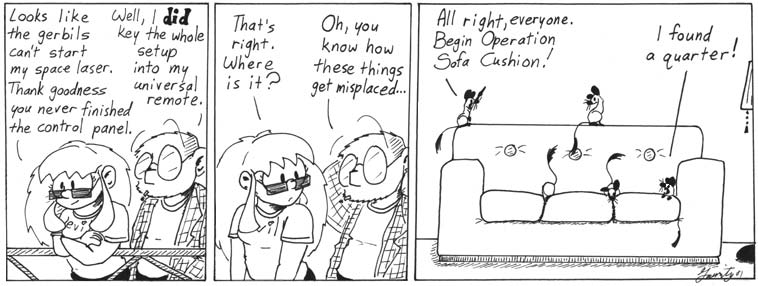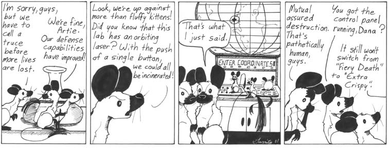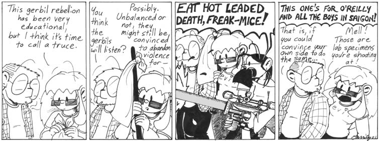 You know, I’ve gotten a lot better at drawing gerbils since these strips, but their little expressions and poses are still pretty funny. This is one of countless strips that would be improved by some damn backgrounds, though. I hate drawing backgrounds.