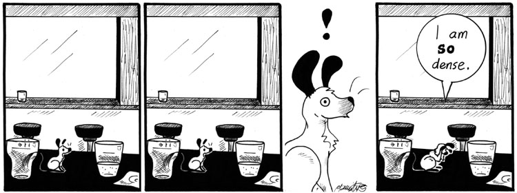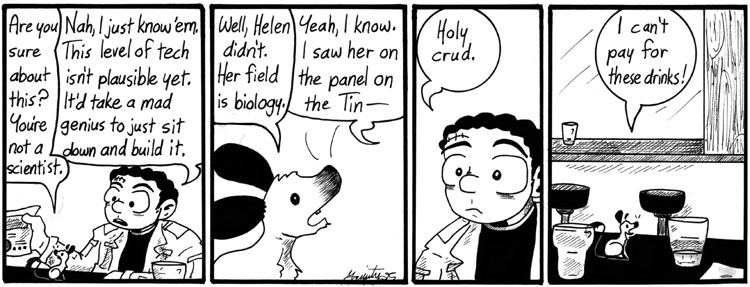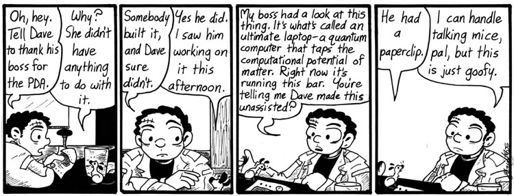 Yeah, so I wrote this during the time I had a subscription to Scientific American and was absorbing a lot of weird tech ideas. More than anything, though, I wish I knew what Titus and Artie were discussing prior to this strip. Those two could have some strange conversations.