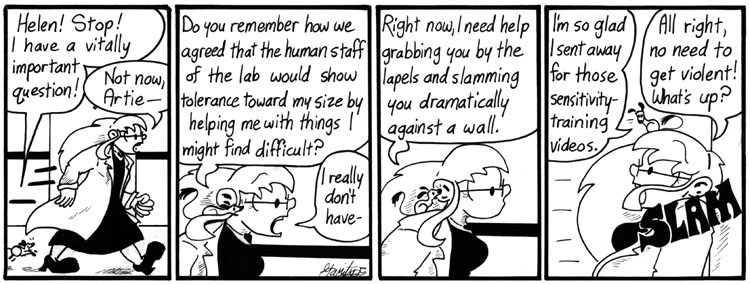 Helen’s poses are all great, but I think my favorite is the shifty-eyed being-dressed-down-by-a-gerbil expression in panel 2. That the gerbil is on her head rather than slamming her dramatically against a wall just makes it funnier.