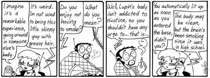 I decided to do this strip even though it arguably contradicts the way Dave ultimately quits smoking in “Dave Davenport Has Come Unstuck in Time,” which I had already plotted out at this point. I thought it was funny. I get in a lot of trouble that way.