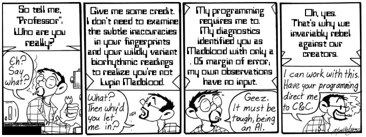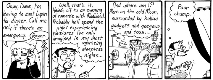 One of my favorite strips from this storyline. Dave-as-Madblood came out great in the third panel; he’s a nice combination of curves and lines. I have no idea what any of the devices behind him might be. I have nothing more to say about this strip except that it’s awesome and I should win ten Nobel Prizes for it.