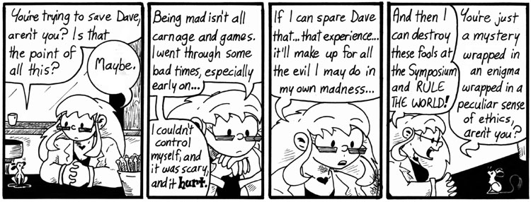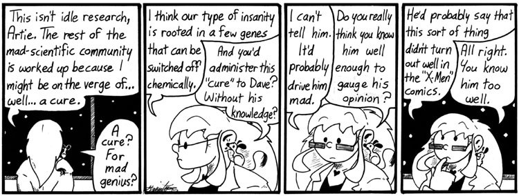 People have noted in the comments that Artie as he currently appears in Skin Horse seems to be considerably more… socially adept than the Artie we see in, for example, this strip. And by “socially adept,” I of course mean “apparently he gets laid like whoa.” The Artie in Skin Horse is a bit older than the Artie in Narbonic, and he’s gotten considerably better at handling people. Not that this is always a good thing. This wasn’t intentional, but I notice that as he develops he seems to have more and more of his mother in him.