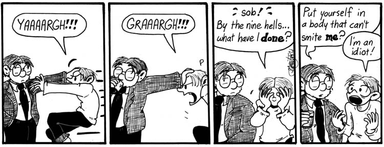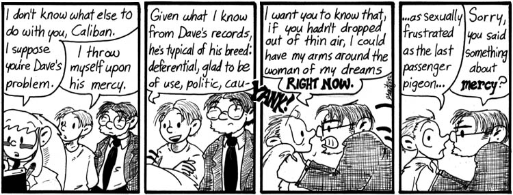 I just want to say that this strip is pretty amazing in its delivery, in that it manages to make the erudite and eloquent Caliban’s panel 3 line seem almost like a non-sequitur. (And, of course, one can’t overlook the quality of Dave’s superbly underplayed reaction.)