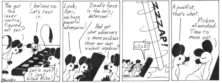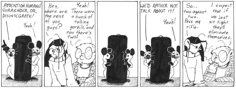 As of this strip, the rebel gerbil forces are reduced to Dana and an unnamed second gerbil. It’s probably either Allison or Jaye, since those three were my housemates in my senior year of college.