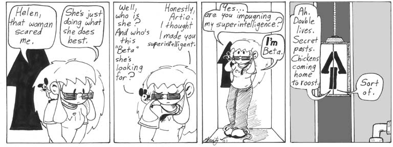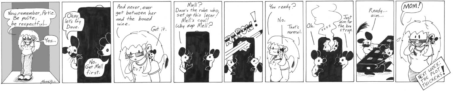 Interesting bit of Shaenon gerbil trivia: They are not only genetically-modified for intelligence (if not sanity), they are also stronger than they look. The remote masses the same as the average gerbil, yet they are able to manipulate it as if it were paper. This becomes an important tidbit later when Artie starts throwing his weight around.