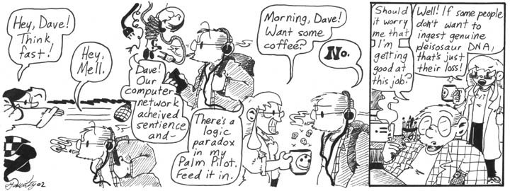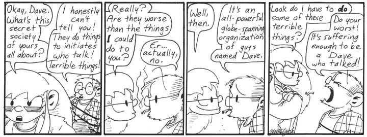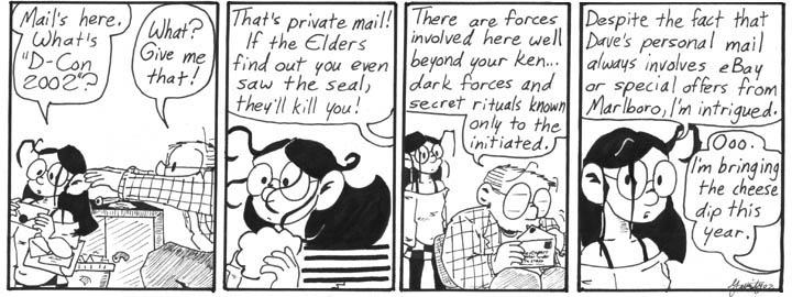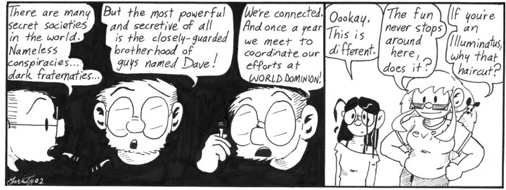 I remember writing these strips in the summer of 2000, on the long bus ride to and from work, and laughing my ass off. Now I’m not entirely sure how I came up with the Dave Conspiracy idea or, more to the point, why I thought it was funny. I can only assure you that at one time I thought it was the most hilarious thing ever. Sometimes my brain makes weird burps.
