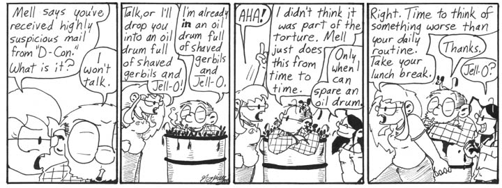 I still dig this one. I mean, look at all the gerbils. I guess if this strip was in color they’d be pink, being shaved gerbils and all, but they’re cute in black-and-white.