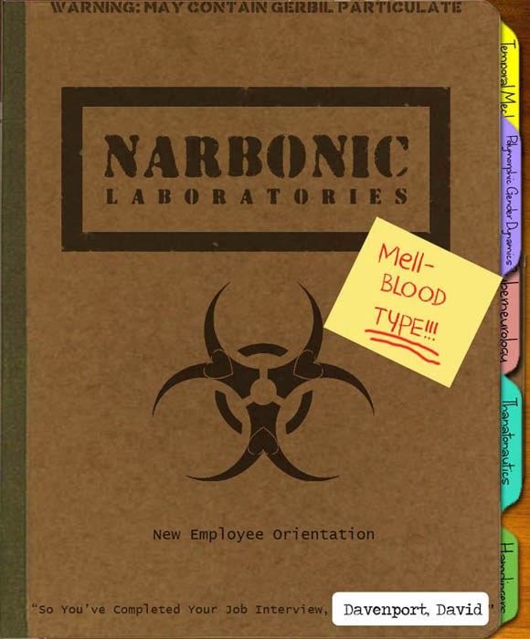 Joseph writes: The labels on the side say “Temporal Mechanics”, “Polymorphic Gender Dynamics”, “Cyberneurology”, “Thanatonautics”, and “Hamdingers”. Obviously areas of ongoing research at Narbonic Labs.
