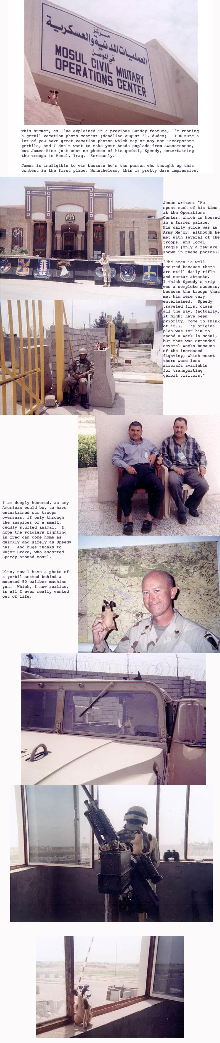 This is still one of my favorite sets of gerbil photos. I was so proud to have a plush gerbil entertaining the troops. Which reminds me–I need to catch up on Speedy. Earlier, this year, James Rice sent me this update: