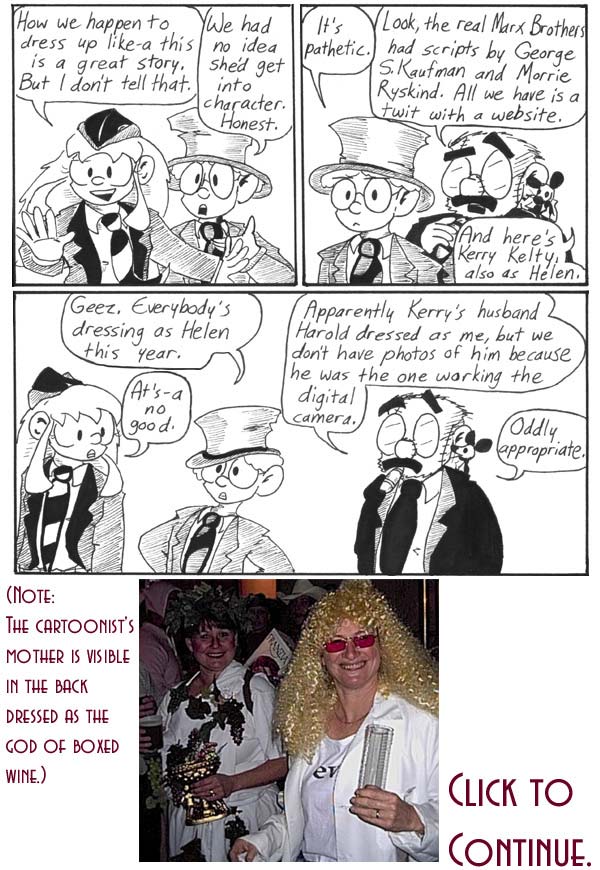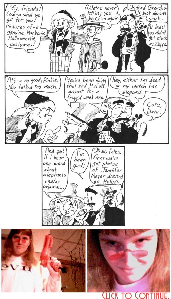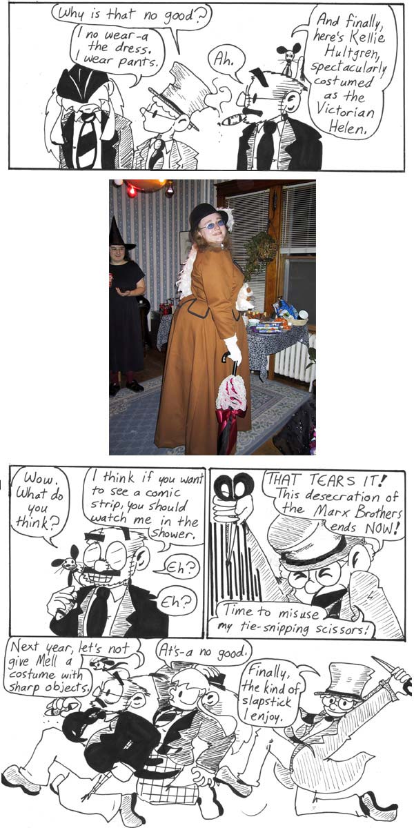 As mentioned previously, Andrew and I dressed as Chico and Harpo Marx for Halloween that year, so the Narbonic cast is just following our lead. It actually worked out relatively well, even given that Dave has to be not just Groucho, but Zombie Groucho.
