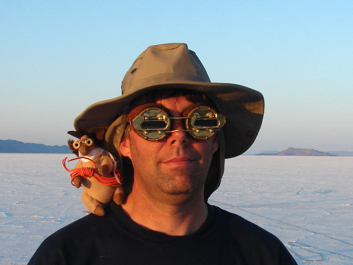 Later, Speedy visited the Bonneville Salt Flats, as he often does. But this time he had tiny steampunk goggles!