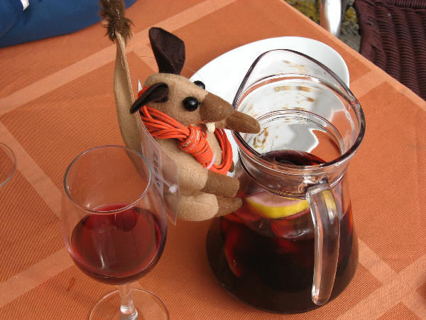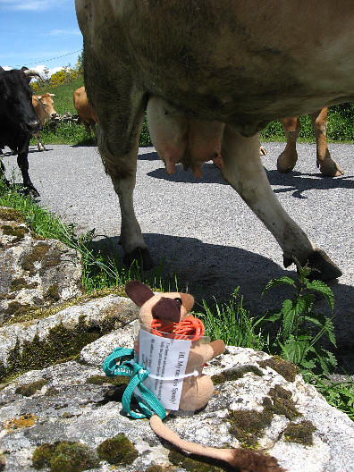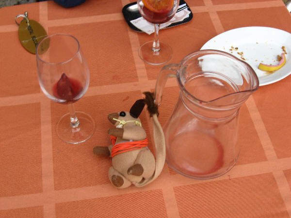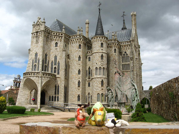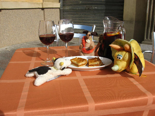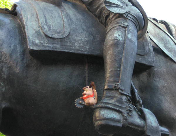 In May, my good friends Betty & Daniel, (and apparently a small cow and dinosaur), went to Spain to hike the El Camino de Santiago, a 250 kilometer pilgrimage trail, to the Cathedral of Santiago de Compostela in Galicia. Speedy went along for the cultural enrichment. The cultureal enricment apparently took the form of sitting on Don Quixote’s spur, and drinking too much sangria, althought there was the amazing artchtecutre to see as well. 250 kilometers is a long way to walk when you have tiny legs so Speedy covered much of the trail in Betty’s backpack. I think it was awfully nice of her to offer to carry Speedy when he got tired. Betty, Danial, Speedy and the rest of the group made the complete journey, and the humans got compostelas, certificates of accomplishment given to pilgrims on completing the Way.