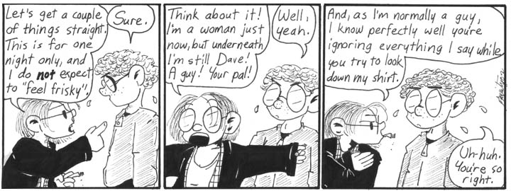 I seem to recall Dave exclaiming after the break-up something along the lines of “Good lord! I’ll never have lesbian sex again!”. I remember that the underage barfly that turned out to be their daughter was there for it… Anyway, I assume this means that Girl Helen is attracted to both Boy Dave and Girl Dave at that point. Mostly because she likes him for his mind, right?