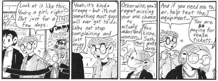 I started looking at the first panel of this strip before I thought to get the commentary, and this provided just enough of a distraction that I was wondering as it loaded why Seth was going to the movie with a recognizable non-Dave character.