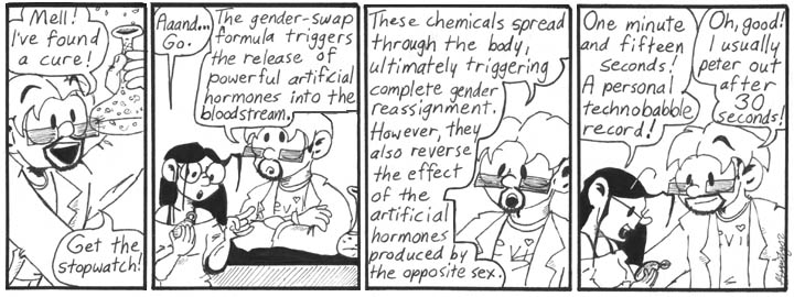 This really isn’t a minute and fifteen seconds’ worth of dialogue, but goodness, aren’t those word balloons big enough? This is the kind of gag I could do in any Narbonic storyline, but it works fine here.
