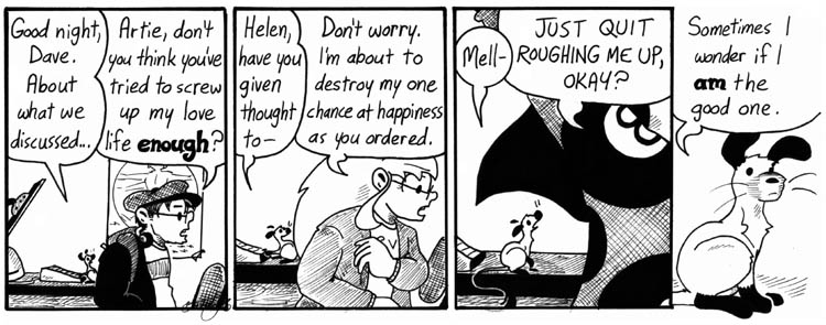 I guess I could have done this gag at any time after Artie got his human form, but what the hell, it’s pretty great here. I’m very fond of this strip, especially Mell in the second panel. Drawing shirt collars is hard.