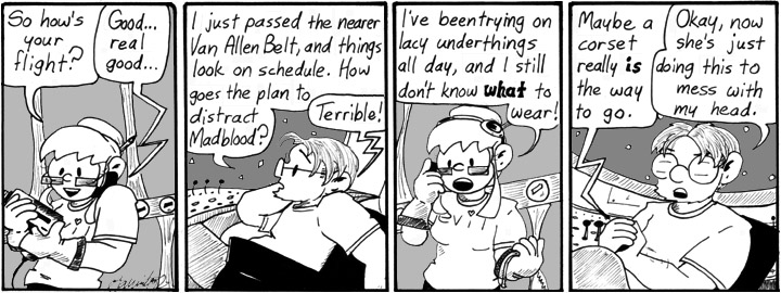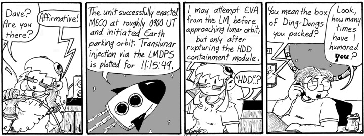 All the NASA acronyms Dave uses are real except for HDD, which, of course, stands for “Hostess Ding-Dong.” This is another of my favorite strips from this storyline, because I would totally do this. I wanted very badly to be an astronaut when I was a kid, in between wanting to be a writer and a psychiatrist.