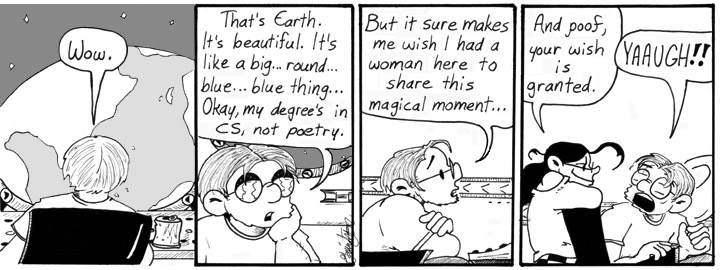 This is another case where Dave is standing in for me, albeit in his computery, non-poetry-composing way. I wanted to have at least one strip where the characters could pause and note that going to the moon is super freaking awesome.
