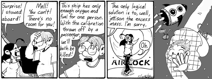 I note that pretty much all of the debunkers and solvers of The Cold Equations fix on the mass problem; not the oxygen problem. That’s true for most of the comments here; the solution in (I think) next week’s strips, and the cut-off-the-limbs story. (As I recall, the pilot in that one is a woman; presumably that’s why she’s wiser and more empathic than the one in Godwin’s story. I don’t remember whether or not she’s a Latina, though.) It doesn’t seem unlikely that there’s stuff that can be safely jettisoned; but “Just saying No” to breathing is a bit harder!