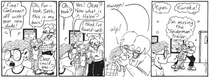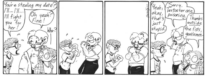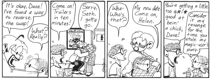 I have to admit I still like this strip too. It’s just so dumb, and the idea of Dave being the manliest character in the room is…well, sad, really, but funny. I remember my dad teaching me to make a fist with my thumb on the outside when I was about four years old. He explained that it was to keep me from breaking my thumb in the impact of the punch, which was so likely to happen. About as likely as either Helen or Seth inflicting any kind of damage in this melee.
