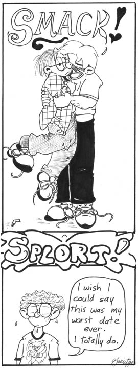 I’m still pretty fond of this peculiar conversation. It’s weird and goes off on odd tangents and makes passing reference to someone eating a GURPS handbook…yeah, it’s Narbonic, all right. I also like Dave’s freaked-out expressions contrasted with Helen’s placidity. This is all Dave’s own fault, of course, and he could have avoided it by just not going on the date, but then where would we be?