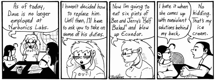 One of the interesting things about Helen as a character is that she’s a surprisingly decent person – for, well, you know, an insane mad scientist ever teetering on the brink of Complete Monsterdom. Then again, that’s kind of key to Narbonic as a strip – if she wasn’t so sympathetic, the strip wouldn’t be nearly as enjoyable.
