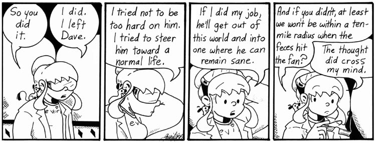 I like the apparently unintentional implication of depth of those speech balloons in panel 3 – Dave’s “See?” recedes into the corridor behind Artie’s balloon, which in turn is behind Dave’s “Exactly.”