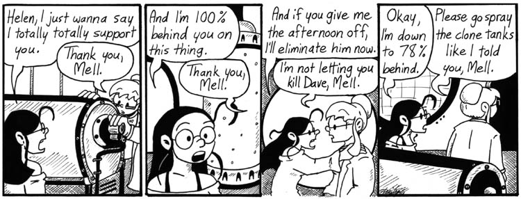 I like this strip a lot. I should have done more strips of just Helen and Mell talking, because their respective brands of outlandishness play off each other well. Also, I drew some great random heavy equipment.