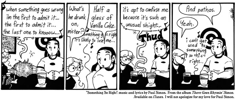This is a very self-indulgent strip. I felt kind of embarrassed about doing it even at the time, but I liked this song for Dave, and I was feeling sentimental about the encroaching end of Narbonic. Allow me my squishy moments!