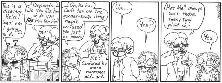 Actually, one of the things I really love about this strip is how much femDave and Helen-man look like themselves. I’m not sure what it is about the way they’re drawn that so captures who they are when they have their normal genders.