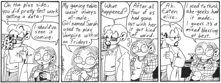 Since the GM is based on my ex-boyfriend, this is an extremely veiled self-deprecating comment. I don’t have much more to say about this strip, except that I hate it when I draw the characters with big half-lidded eyes like in the second panel. It looks like friggin’ “Garfield” or something.