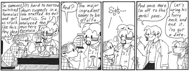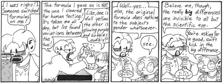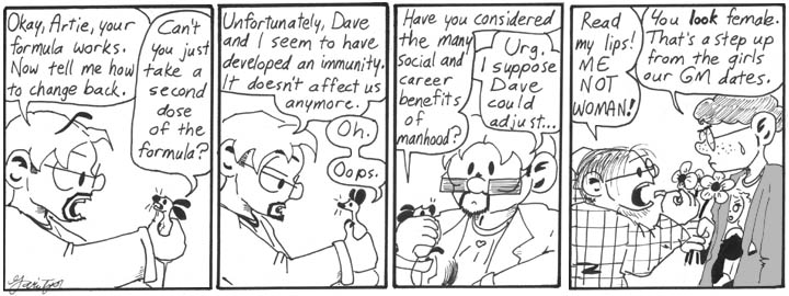 Most of the strips I cut from this storyline involved a shopping trip wherein Dave and Helen go out to get new clothes because they’re completely different sizes now, and Dave gets dolled up in an absolutely adorable sundress. I ultimately decided that this subplot didn’t go anywhere and wasn’t all that funny (aside from the sight of a cranky Dave in a pretty sundress with that ubiquitous cigarette stub dangling off his lip), so I killed it. I also had Helen consider staying male, which I guess would have been a subversion of the standard gender-swap trope of having the formerly male character decide to remain female. One of these strips mentioned the Crabtree Grant for Women in Mad Science, a reference to which I eventually worked into “Professor Madblood and the Lovelace Affair.”