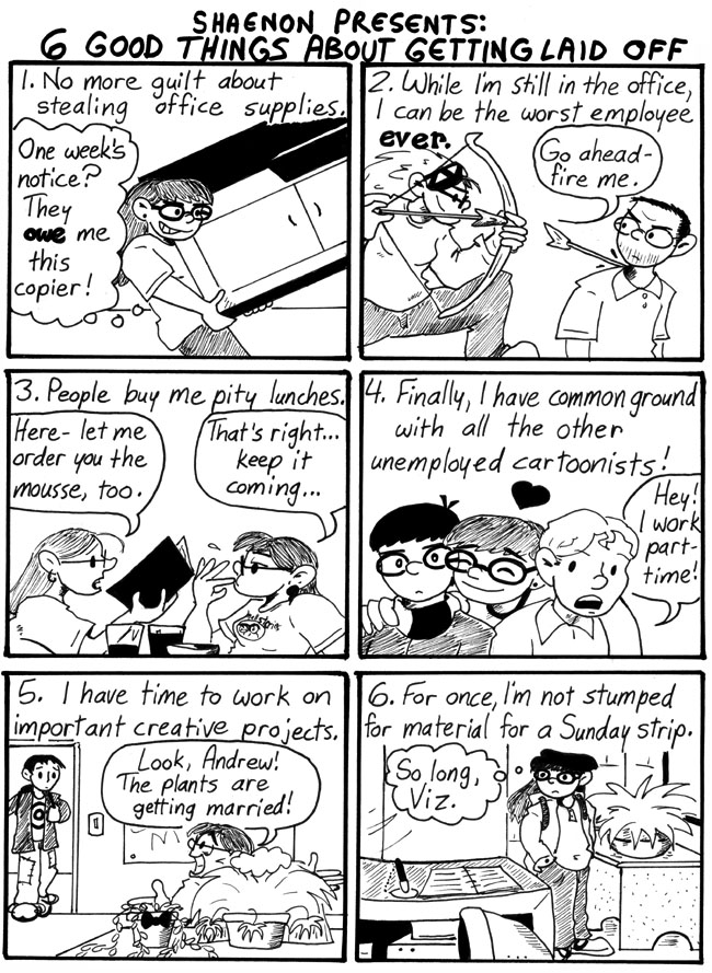 I imagine this strip caused a lot of confusion for people down the line, inasmuch as, six years later, I’m kind of still working for Viz. After I was laid off as the front-desk receptionist, I started working for the company as a freelance editor, a job that’s continued to support me to this day (although not as well as it used to–thanks, economy). If it helps, none of this makes any sense to me either.