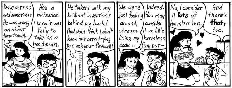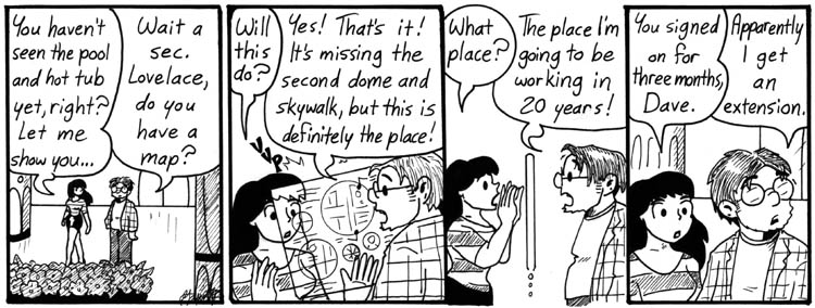 I wrote this one at the same time I was writing the time-travel story. Which is why they fit together so neatly! I even drew a skywalk into this week of strips so the reference in this strip would make sense. Finally, all the ridiculous advance planning paid off.