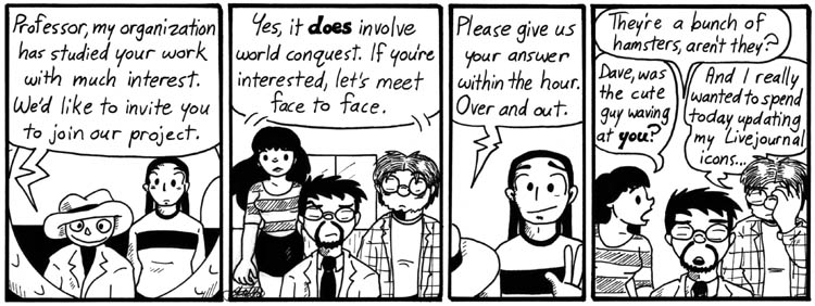 Who’s to say they don’t? Maybe they have achieved sentience, and they come by here to read Narbonic, and leave spam because it’s the only way they know to express their feelings. Maybe when they leave weirdly eloquent pleas to have us buy designer clothing knockoffs, what they’re really saying is, “This webcomic is amazing. I really like the sensitivity with which you treat the plight of Digital-Americans like Lovelace. If she ever ditches those meatbags, have her look me up.”