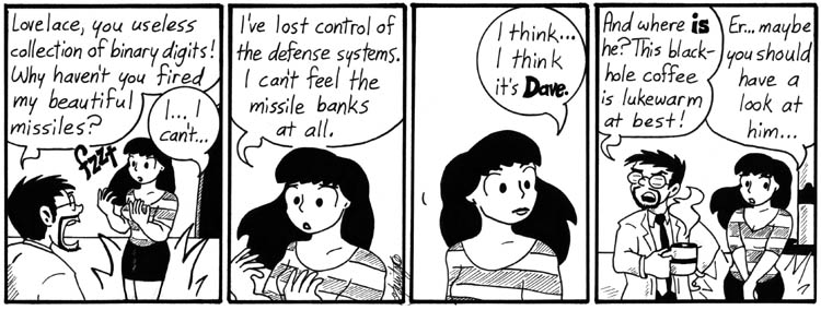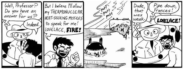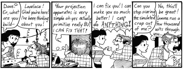 Rachel, I know how you feel. Narbonic showed to me how a comic could have individual punch lines for each page, yet have the overall story build to a climax and resolution. If I could do a page a day like Shaenon, I might actually complete my comic in the lifetime of the Universe.