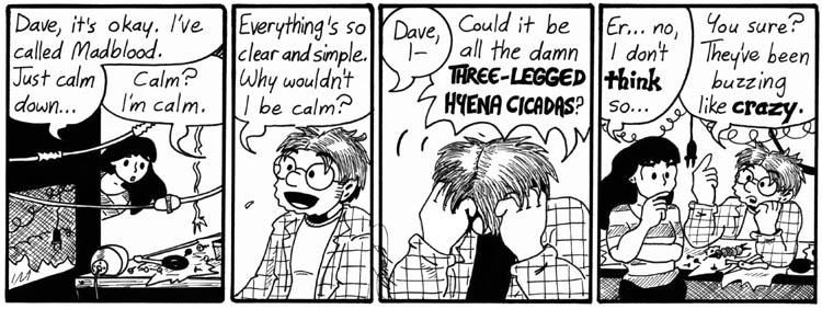 The three-legged hyena cicadas are a reference to the Of Montreal song “Lecithin’s Tale of a DNA Experiment That Went Horribly Awry.” Originally I wanted to pepper this storyline with mad song lyrics, but I only worked in a couple.