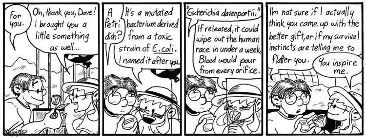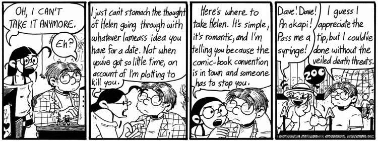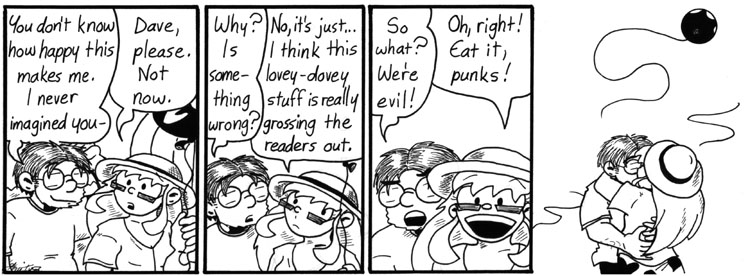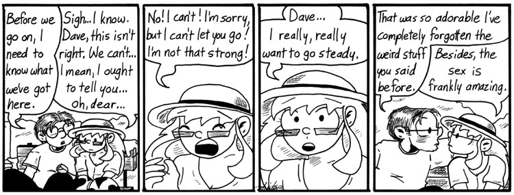 This strip is good, but Helen’s face is out of whack in the third panel, and her face is the entire focus of the strip so I couldn’t afford to screw it up, but I did, and now I can’t stop staring at it. This is the kind of thing that probably only bothers me. At least Dave and Helen look good in the first and last panels. Dave clearly has no chance in this relationship.