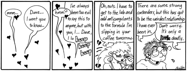 In the first panel, you can see a couple of Dave’s Battle Beasts (the deer and the cat) and a flier for the Valentine’s Day party. This strip is brimming with Narbonic nostalgia.