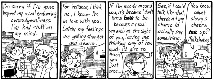 When this first ran I didn’t have the thought-balloon pattern along the edge of the panel to indicate that most of this was going on in Dave’s head, and it was way too confusing. I went back and changed it later.