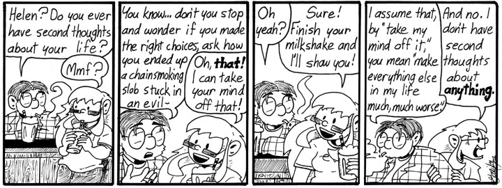 We’re at the point in this webcomic’s development where these whimsical adventures are prefaced with some relevant existential/romantic moping on the part of Dave or Helen. Previously it was Dave sighing about his looks, and now it’s Dave sighing about his past choices. If my memory serves me correctly, next storyline begins with some introspection on Helen’s part.