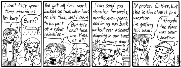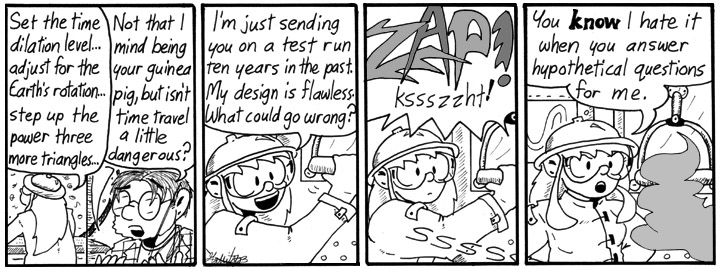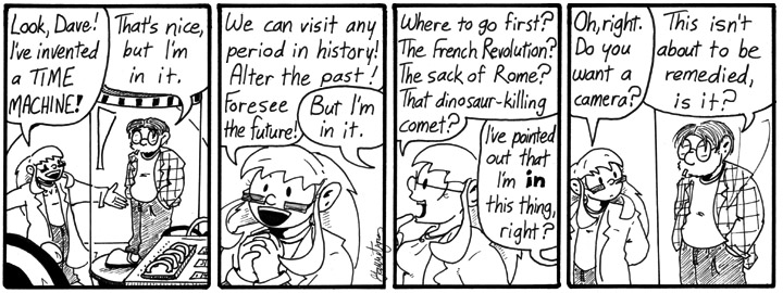 Really simple gag, but that’s fine. Simple is good. Speaking of simple, is this an awesomely easy-to-draw time machine, or what? I’m so lazy.