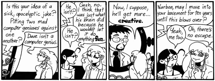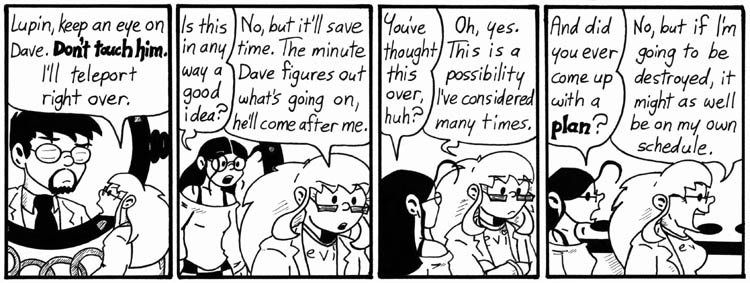 I don’t have much to say about this strip, but I do like it. Doing a four-panel strip like this, you don’t get a lot of chances to just have the characters talking, but all the dialogue in this one is good. Plus it gets in a surprising amount of plot. So good work, me.