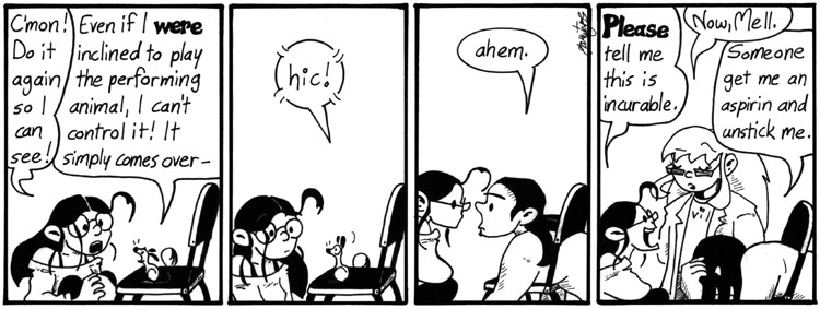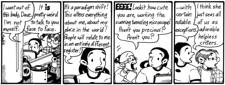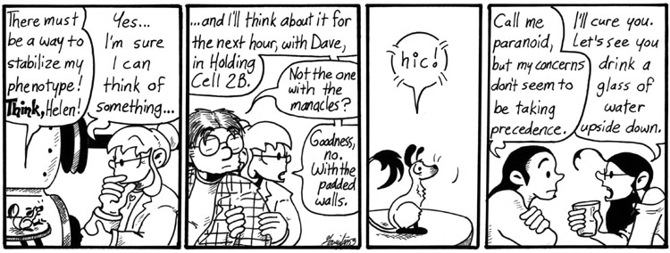 This strip gives the impression that Artie’s transformations are instantaneous, in the tradition of countless old TV shows. What this means in-comic is that Helen’s species-swap technology is a tad tidier than Artie’s own gender-swap technology (“splort”), even though it is, as demonstrated, a tad less curable.