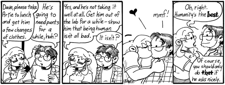 (Well, OK, truth be told, I didn’t notice Artie was sitting until Shaenon mentioned the height thing in her note. But Artie’s sitting makes Dave’s relative height in the first panel a little perplexing, unless maybe he kneeling to get a better look at the screen or something.)