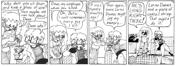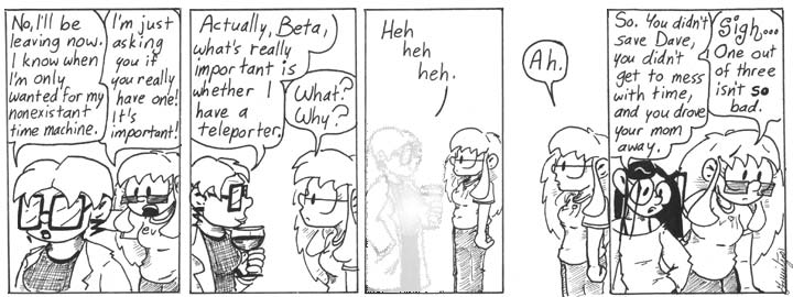 Obviously, I did the teleporter effect with a couple of Photoshop filters. Not all that well; it’s kind of pixelated around the edges there. Oh, well. It gets the point across. And with that Dr. Narbon makes her exit, having done what she came to do: kill Dave and drink all the booze in the lab.