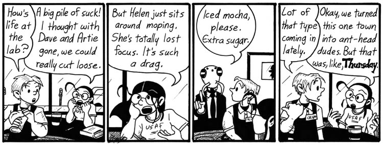To be honest, when I hit panel 3 I was kind of hoping that the ant head dude wouldn’t actually be explained in panel 4, and would instead merely imply that breaking up the core characters has undermined the stability of the strip’s reality. But this works too.