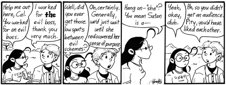 This is a silly strip. I just wrote it to fill out the week. Sorry, everyone. I do like the idea of Satan sitting around sulking between evil schemes, though. So there’s that.