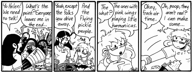 This whole week of strips was T Campbell’s idea. Much earlier in this storyline, he emailed me to say that he felt I hadn’t done enough to develop the idea that Helen would be unstable (well, more so than usual) without Dave around, and I needed to dramatize it instead of just having Mell talk about it. He was right! Hence this week.