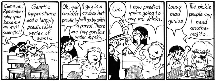 On the night of my first date with Andrew, when he was waiting at a curb for me to show up, a man with a parrot on his shoulder walked up to him and asked him if he knew any good bars. Ever since then, Andrew has wondered how his life would have gone if he’d gone off with that guy instead of waiting for me. This strip is a tribute to the life Andrew never led.
